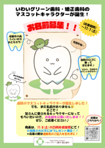 🦷✨【いわいグリーン歯科・矯正歯科のマスコット誕生!】✨ いわいグリーン歯科・矯正歯科では、 このたび、マスコットキャラクターが誕生しました!🎉 その“名前”を、皆さんから募集します! 📅応募期間:~11月1日(金)まで 💡応募方法:受付 または 下記のURLから 親子での応募も大歓迎😊 あなたの考えたお名前が、みんなに呼ばれる日がくるかも!! そして選ばれた名前は… 🎊 11月8日(土)25周年感謝祭で発表! 当選された方には、嬉しいプレゼントも..! ぜひ感謝祭当日の発表をお楽しみに!! 👉[応募フォームはこちら] https://forms.gle/yoXiN7UF1LNcANQ19