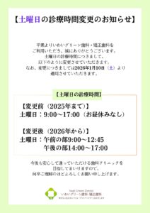 【お知らせ】土曜日の診療時間変更のお知らせ|坂東市の歯医者|いわいグリーン歯科・矯正歯科