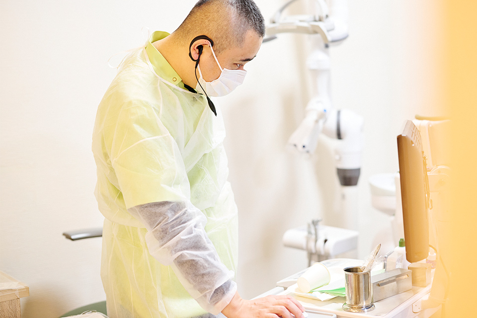その日の診療準備を行います。必要に応じて、他の先生方や歯科衛生士、技工士に症例の相談をすることもあります。